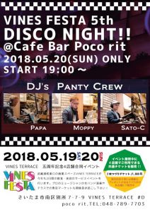 お知らせ Published by SLOW JAM on 2018年5月15日 武蔵浦和のVINES FESTA 5th Anniversary 5/20(日) 19:00~23:00 Caffe Bar poco ritにてDisco NightにGuest DJとして出演いたします。お時間ある方はお越しくださいませ。 住所 さいたま市南区別所7-7-9 VINES TERRACE #D TEL 048-789-7703