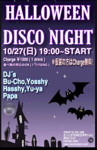 ハロウィンディスコナイト♪ Published by SLOW JAM on 2019年10月14日 ~ HALLOWEEN DISCO NIGHT ~ 10/27(日) 19;00~STARTです! ハロウィンということもあり、仮装で御来店された方には なんとチャージ無料!! 今回も踊って呑んで、素敵な夜にしましょう★ 皆さんの御来店、お待ちしております(*´▽`*)