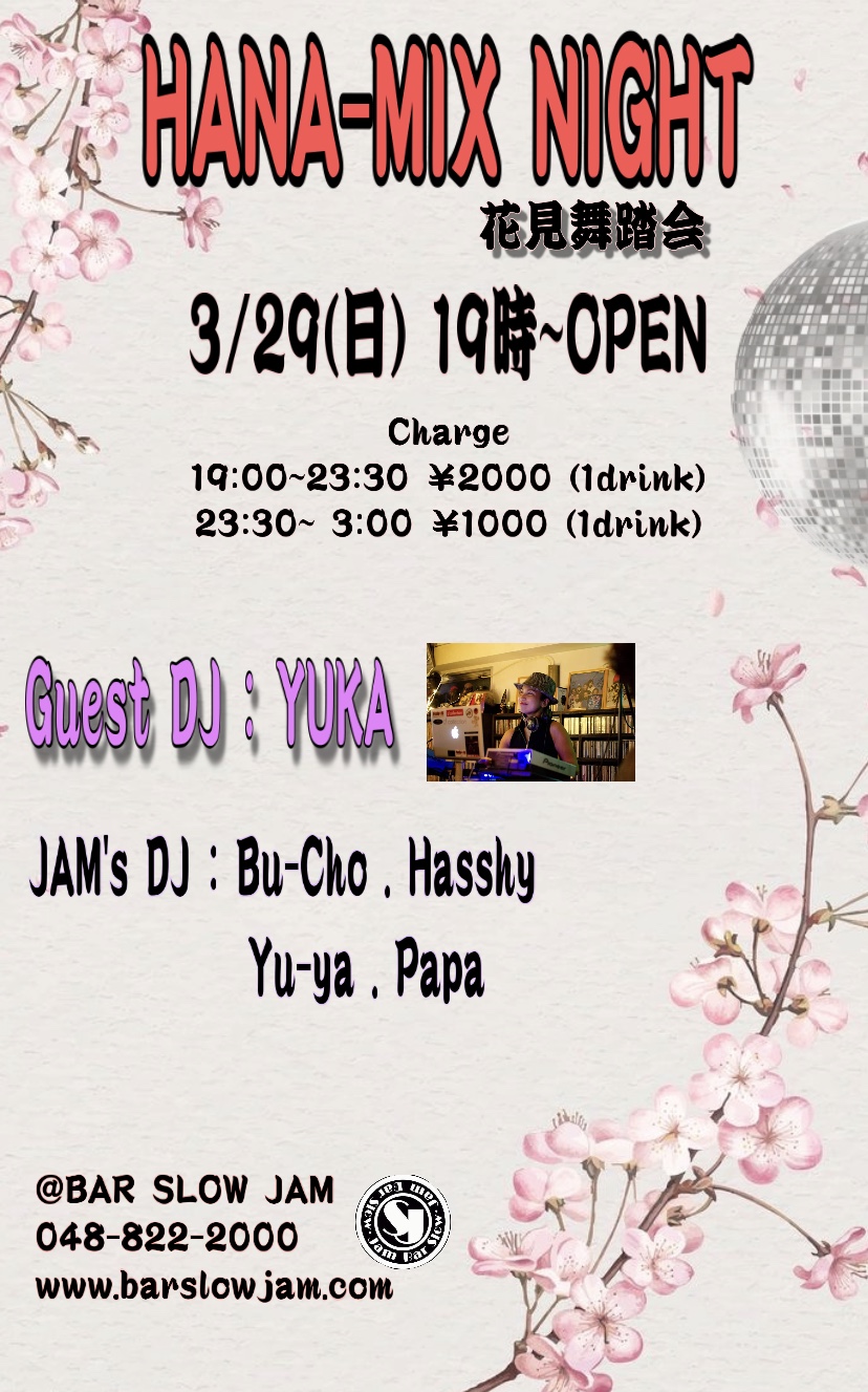 3/29(日) イベントです♪ Published by SLOW JAM on 2020年3月3日 今月のイベントは HANA-MIX NIGHT です(´▽`*) 段々桜の季節になってきましたね♪ 今回のGuest DJはYUKAさんですよ(*´▽`*) 少しでも明るい日常が戻ることを祈って、、 皆さん一緒に盛り上がっていきましょう(≧▽≦) 沢山の御来店お待ちしております!!